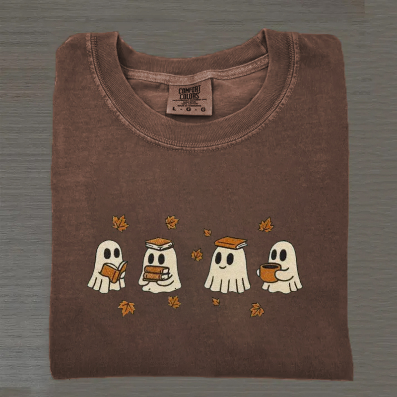 Cute Ghosts Reading Books Autumn Embroidered T-shirt