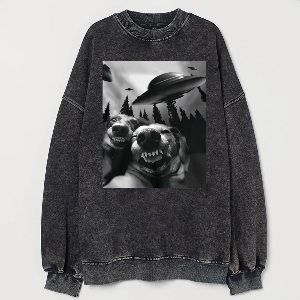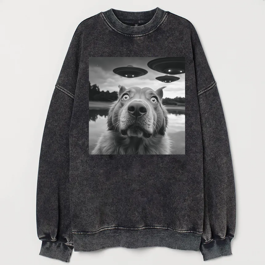 Cat Selfie With UFO Art Acid Wash Sweatshirt