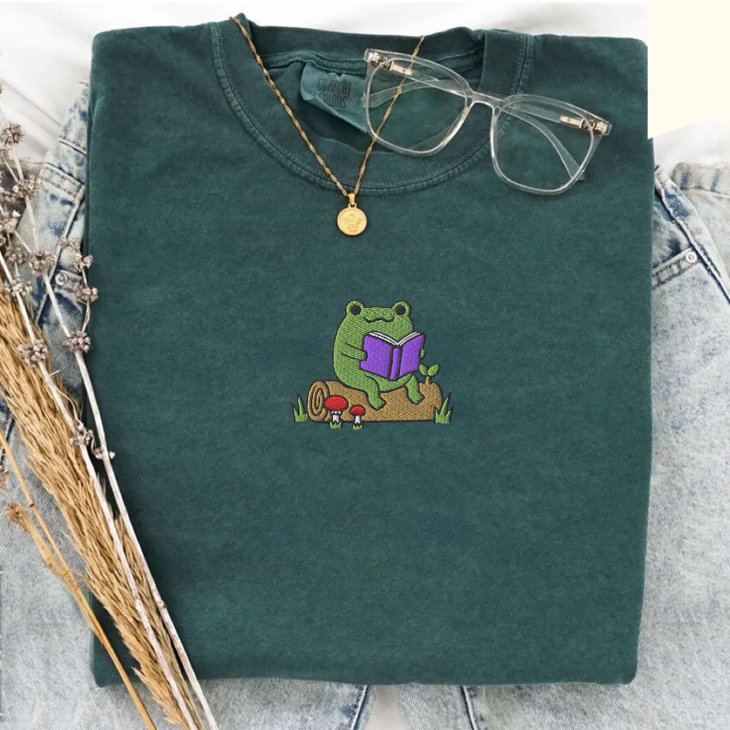 Frog Reading On A Log Embroidered T-shirt