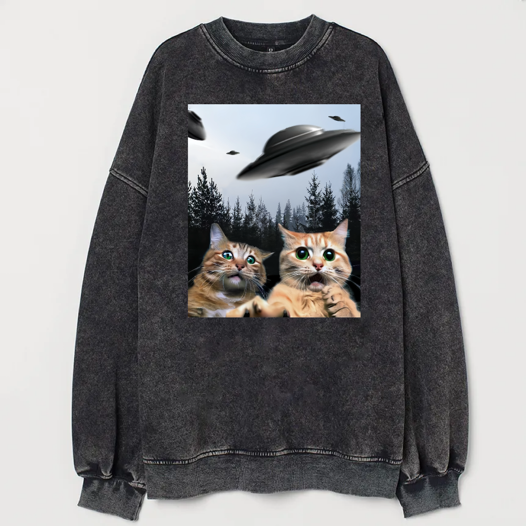 Christmas Cat Selfle With UFO Art Acid Wash Sweatshirt