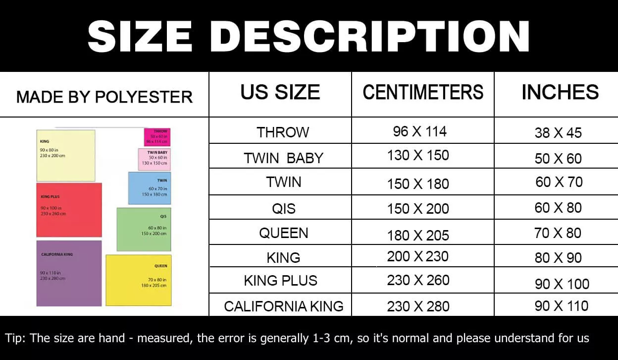 Size: Baby (30×40), Throw (96 x114), Twin Baby (130 x150), Twin (150 x 180) , QIS (150 x 200) , Queen (180 x 205),King (200x 230) ,King Plus (230 x 260), California King (230 x 280)